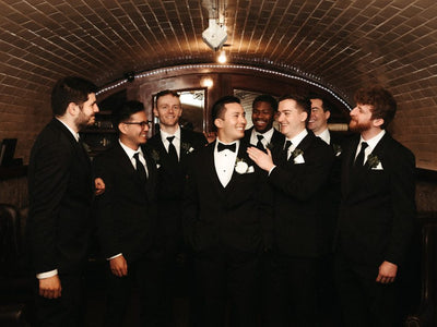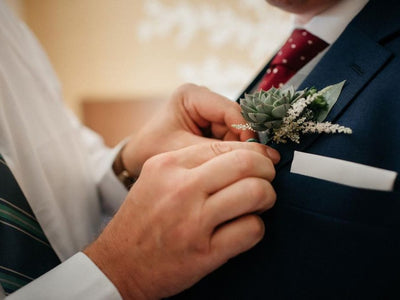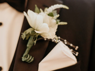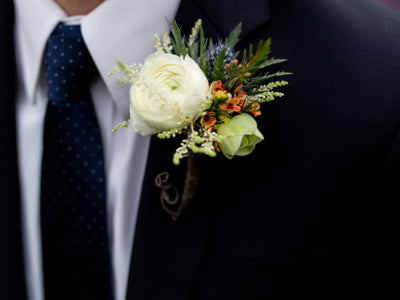 A petite arrangement that pokes out from the breast pocket, an alternate to the traditional boutonniere.