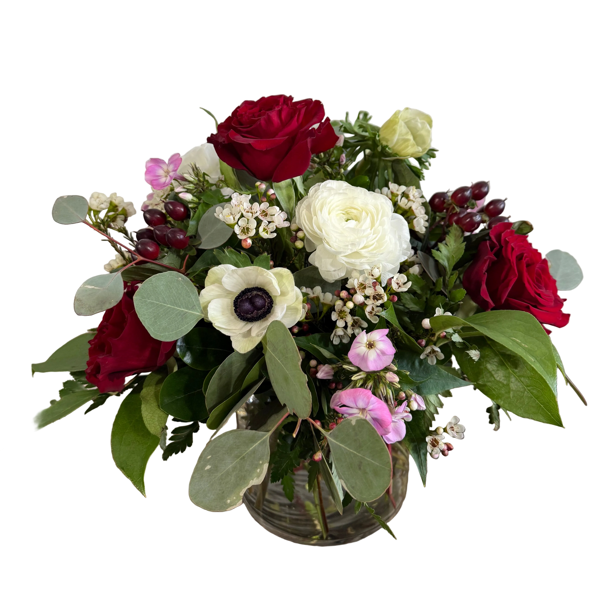 Hearts roses and anemone make this beautiful arrangement what it is! Complemented with phlox, hypericum berry, ranunculus, and waxflower. Always made with the freshest flowers.