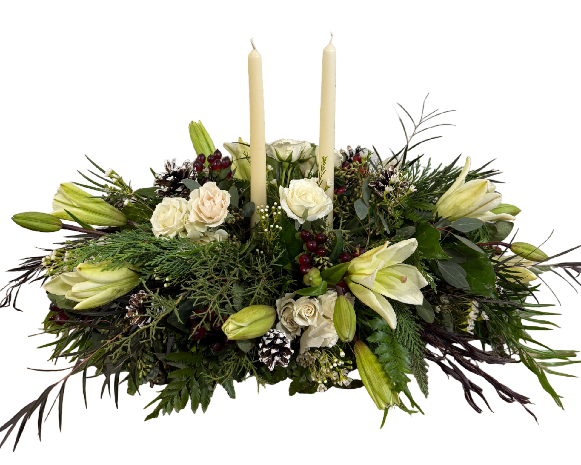 Candlelit white spray roses and lilies blend seamlessly with rich evergreens and delicate snow-dusted pine cones, creating a focal point that radiates quiet sophistication. Perfect for adding elegant holiday charm to any room.